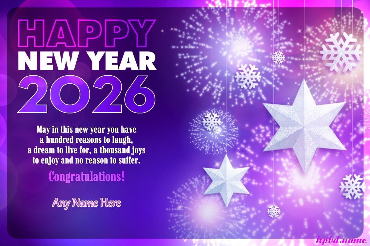 Wishes you happy new year 2026 greeting card with name edit. Customize the happy new year 2026 wishes card with name, here is the best new year 2026 fireworks wishes with name that you can write your name on and send to your friends and relatives on the first day of the year. Spread the happy new year 2026 good luck message with the new year 2026 card with name. Wish your loved ones a Happy New Year 2026 with custom unique creative New Year greeting cards with names. It's 100% free.