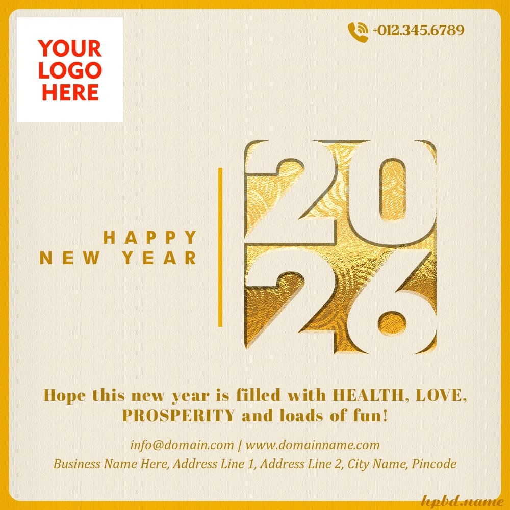 Easy to customize 2026 Happy New Year card with company logo. Easily customize my company New Year 2026 wish card on copper gold background. Embellish Happy New Year 2026 Wishes with inspirational New Year quotes and messages for companies and businesses. You can easily create happy new year 2026 images for your company. This is a trend that companies are looking to impress their customers and partners in this new year.