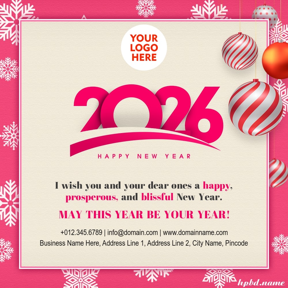 Create new year wishes 2026 with pink number design. Happy new year 2026 image with wishes name and custom company info. New Year is a day of Happiness, joy and blessings. Here gives you possibility to create free custom happy new year 2026 wishes for company, business. The 2026 Happy New Year greeting card design will make your brand.