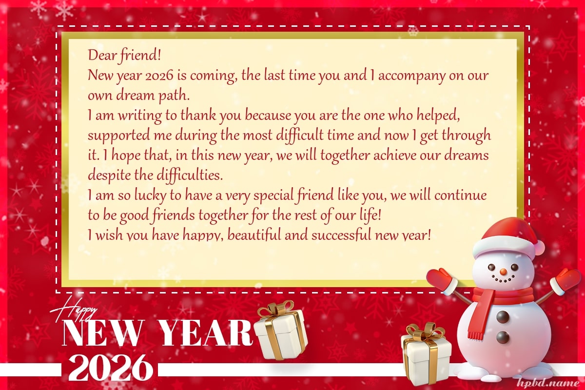Customize new year 2026 greeting card with snowman on red background. Merry Christmas and New Year 2026 with personalized e-cards with names or wishes. New Year 2026 is coming and don't forget to send Happy New Year 2026 greeting cards to all your friends and family members. Browse the huge collection of New Year 2026 greeting cards, meaningful sparkling new year 2026 greeting cards that are exclusively designed and can send your greetings to whoever is celebrating new year 2026 anywhere in the world.